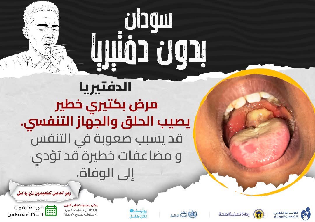 بحمد الله انحسرت بنسبة كبيرة الحميات خاصة حمى الضنك وظهر تباعّا مرض الدفيتريا وهو خطير وقد يؤدي للوفاة ، وقد ظهرت حالة في مدينة بحري – شرق النيل طفلة أصابها هذا المرض وأودى بحياتها .