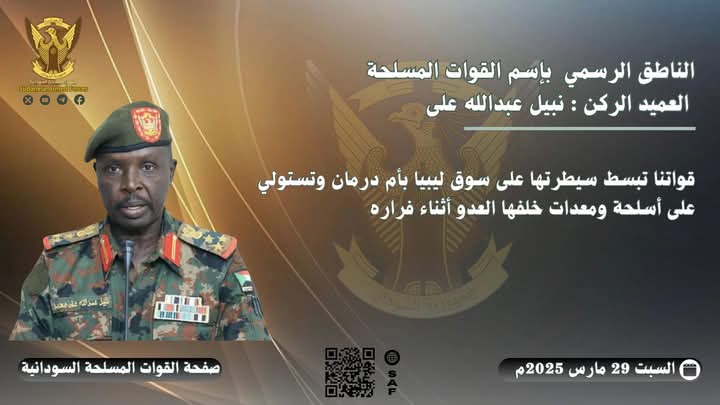 أعلن الناطق الرسمي باسم القوات المسلحة العميد نبيل عبدالله : قواتنا تبسط سيطرتها على سوق ليبيا بأم درمان وتستولي على أسلحة ومعدات خلفها العدو أثناء فراره.