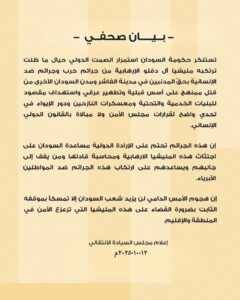 اصدرت حكومة السودان بـيـــان صـحــفـي تستنكر استمرار الصمت الدولي حيال ما ظلت ترتكبه مليشيا آل دقلو الإرهابية من جرائم حرب وجرائم ضد الإنسانية بحقّ المدنيين في مدينة الفاشر ومدن السودان الأخرى من قتل ممنهج على أسس قبلية وتطهير عرقي واستهداف مقصود للبنيات الخدمية والتحتية ومعسكرات النازحين ودور الإيواء في تحدي واضح لقرارات مجلس الأمن ولا مبالاة بالقانون الدولي الإنساني.