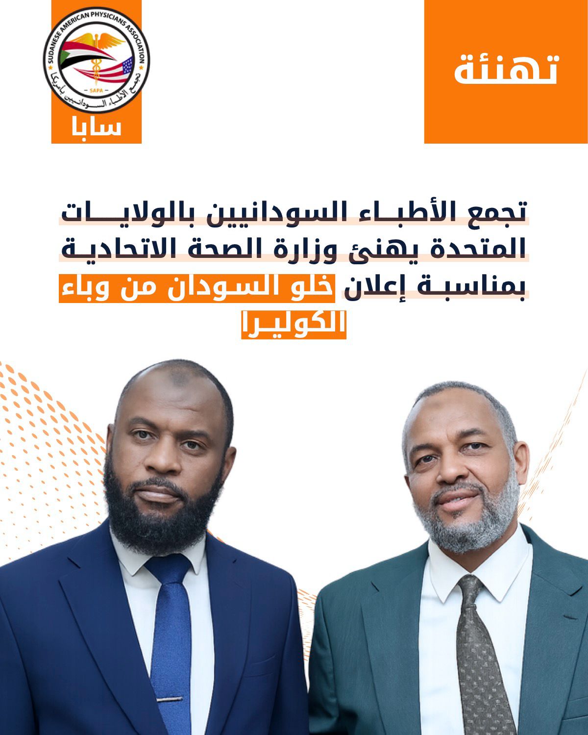 يتقدّم تجمع الأطباء السودانيين بالولايات المتحدة الأمريكية (SAPA) بخالص التهاني إلى وزارة الصحة الاتحادية ووزير الصحة الاتحادي البروفيسور هيثم محمد إبراهيم بمناسبة إعلان خلو السودان من وباء الكوليرا، وهو إنجاز صحي مهم تحقق رغم الظروف الاستثنائية والتحديات الكبيرة التي تمر بها البلاد.