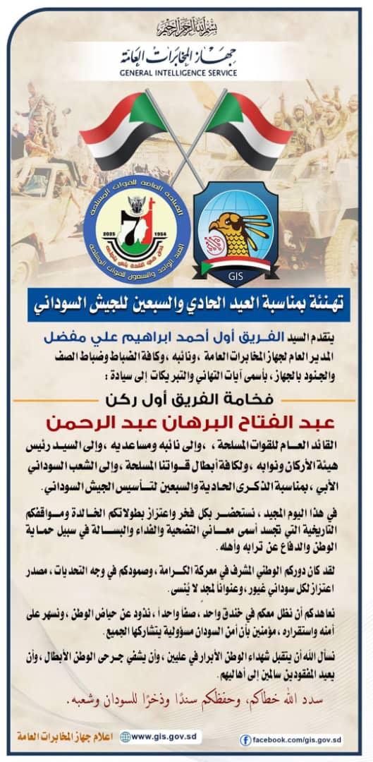 تقدّم الفريق أول أحمد إبراهيم مفضل، المدير العام لجهاز المخابرات العامة، ونائبه، وكافة الضباط وضباط الصف والجنود بالجهاز، بأسمى آيات التهاني والتبريكات إلى الفريق أول ركن عبد الفتاح البرهان، القائد العام للقوات المسلحة، ونائبه، ومساعديه، وإلى رئيس هيئة الأركان ونوابه، ولجميع أبطال القوات المسلحة، وإلى الشعب السوداني الأبي، بمناسبة الذكرى الحادية والسبعين لتأسيس الجيش السوداني.
