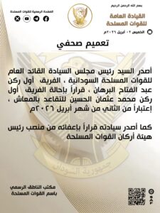 أصدر السيد رئيس مجلس السيادة القائد العام للقوات المسلحة الفريق أول ركن عبدالفتاح البرهان قرارات تم بموجبها تشكيل رئاسة هيئة أركان جديدة على النحو التالي :