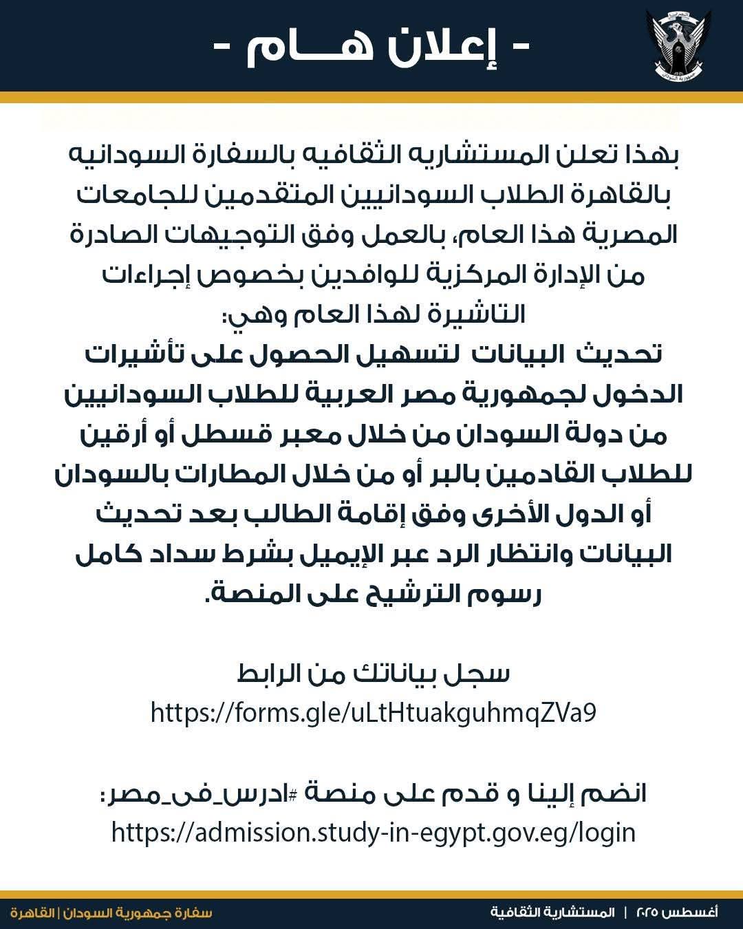 تعلن المستشارية الثقافية بالسفارة السودانية بالقاهرة الطلاب السودانيين المتقدمين للجامعات المصرية هذا العام، بالعمل وفق التوجيهات الصادرة من الإدارة المركزية للوافدين بخصوص إجراءات التاشيرة لهذا العام وهي:
