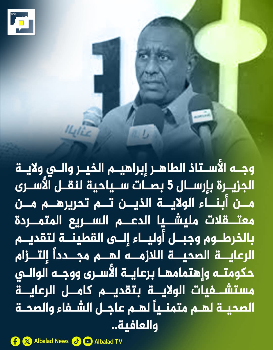 وجه الأستاذ الطاهر إبراهيم الخير والي ولاية الجزيرة بإرسال 5 بصات سياحية لنقل الأسرى من أبناء الولاية الذين تم تحريرهم من معتقلات مليشيا الدعم السريع المتمردة بالخرطوم وجبل أولياء إلى القطينة لتقديم الرعاية الصحية اللازمه لهم مجدداً إلتزام حكومته وإهتمامها برعاية الأسرى ووجه الوالي مستشفيات الولاية بتقديم كامل الرعاية الصحية لهم متمنياً لهم عاجل الشفاء والصحة والعافية ….