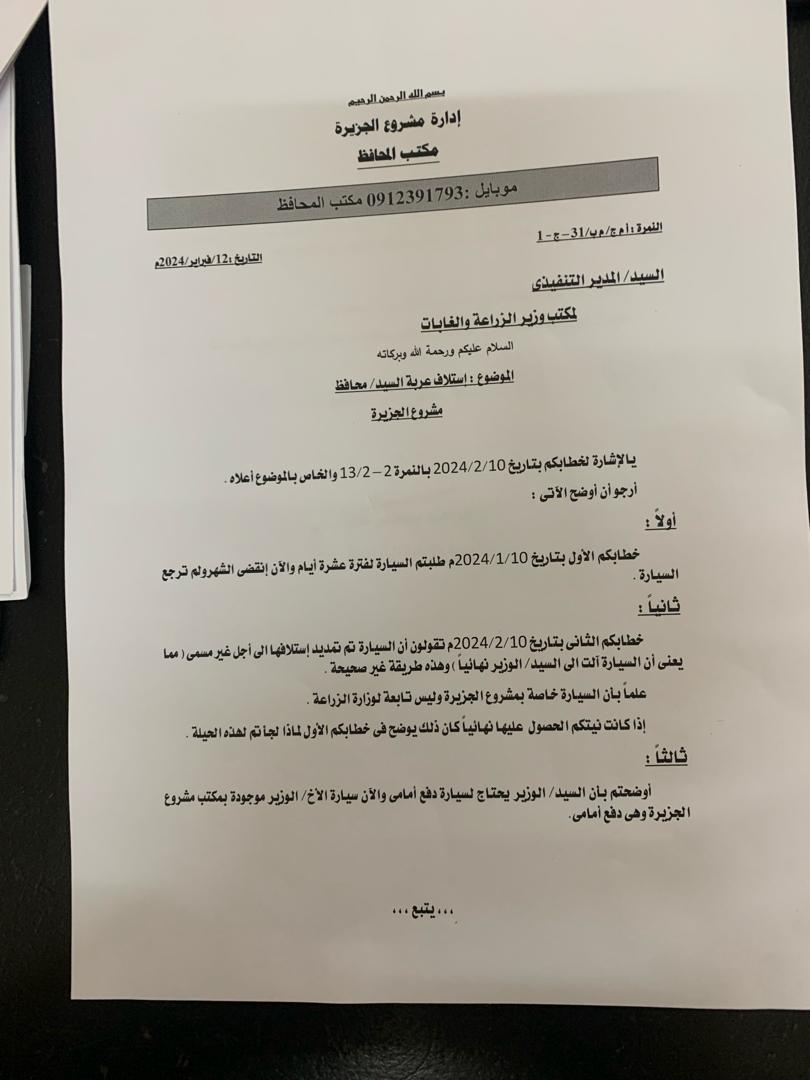 وبعث مدير الإدارة الزراعية بالمشروع إبراهيم مصطفى بتاريخ 12فبراير 2024 ، بخطاب إلى وزارة الزراعة بناءا على توجيه المحافظ د.عمر مرزوق، يطلب فيه بارجاع السيارة بعد أن وصلهم مكتوب من الوزارة بتجديد استلاف عربة المشروع إلى اجل غير مسمى.