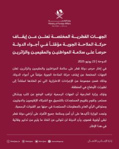 اعلنت وزارة الخارجية القطرية يوم الاثنين في بيان إن البلاد أغلقت مجالها الجوي مؤقتا ضمن إجراءات يجري اتخاذها وسط التطورات في الشرق الأوسط.