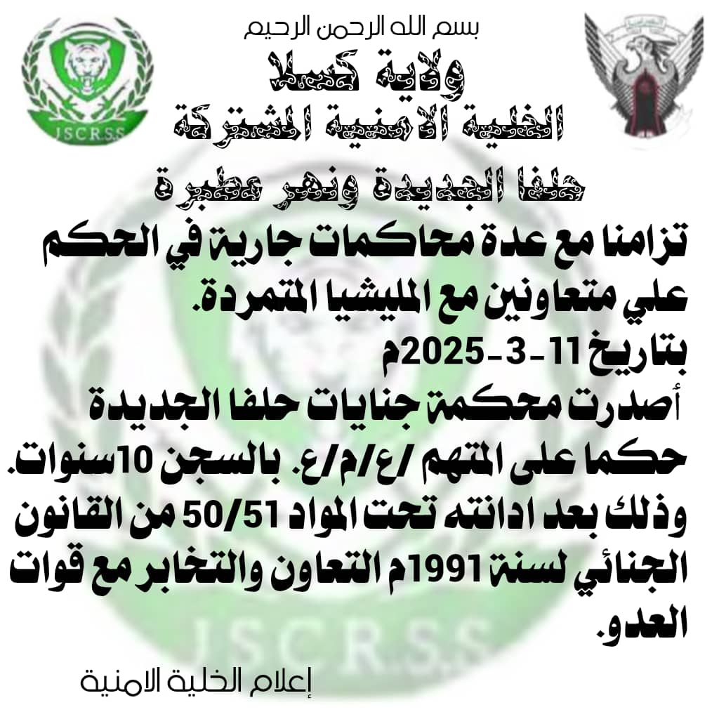 تزامنا مع عده محاكمات جاريه في الحكم علي متعاونين مع المليشيا المتمرده بتاريخ 2025/3/11 اصدرت محكمه جنايات حلفا الجديده حكما علي المتهم /ع/م/ع. بالسجن 10سنوات وذلك بعد إدانته تحت المواد50/51 من القانون الجنائي لسنه 1991م التعاون والتخابر مع قوات العدو.