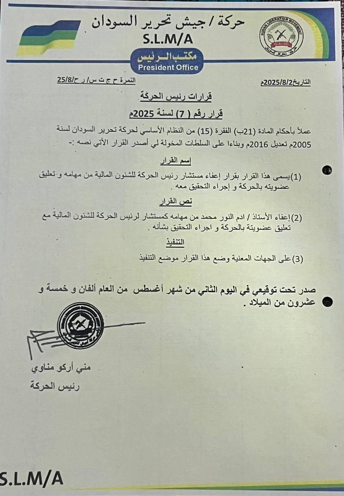 كشف رئيس حركة جيش تحرير السودان القائد مني اركو مناوي عن قرارات باعفاء 3مستشا كشف رين  للحركة واحالتهم للتحقيق وهم  مستشار الحركة للشئون المالية آدم النور محمد ومساعد  الحركة للشئون القانونية محمد محمود كورينا واعفاء المستشار الاعلامي مصطفى عبد الله ابكر ( الجميل) وتعليق عضويته