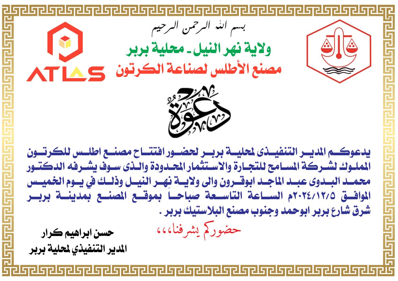 يفتتح المدير التنفيذي المحلية بربر بولاية نهر النيل الأستاذ حسن ابراهيم كرار مصنع اطلس للكرتون المملوك لشركة المسامح للتجارة والاستثمار المحدودة بعد غدا الخميس في محلية بربر بتشريف والي ولاية نهر النيل الدكتور محمد البدوى عبد الماجد ابوقرون وأكد حسن كرار أن حرب دمرت قطاع الصناعة والاستثمار والذي له دور كبير في التنميه بالبلاد وان ولاية نهر النيل ومحلية بربر خاصة تتمتع بمميزات تفضليه في هذا المجال عن بقية الولايات الأخرى وتفتح أبوابها للكل المستثمرين الوطنين والأجانب