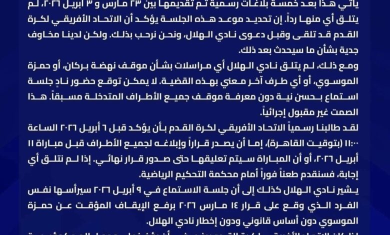 أكمل القراءة »الاتحاد الإفريقي لكرة القدم يرد علي الهلال السوداني فوري نيوز تورد لكم نص البيان … تلقى نادي الهلال اليوم، لأول مرة،…