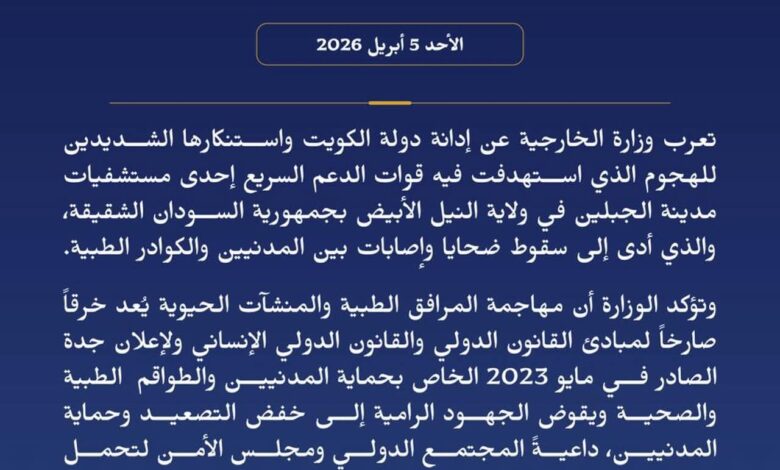 أكمل القراءة »ببيان رسمي تدين وزارة الخارجية بدولة الكويت وتستنكر الهجوم الذي استهدفت فيه قوات الدعم السريع إحدى مستشفيات مدينة الجبلين…